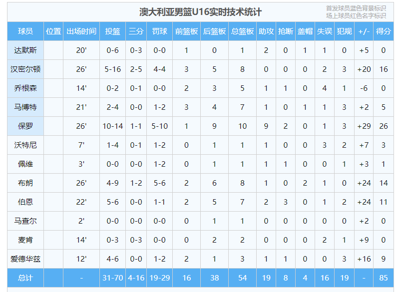 在球员得分方面,澳大利亚男篮表现更为均衡,共有 4 人得分上双,其中保罗更是交出了 26 分 10 篮板 9 助攻的准三双数据,成为球队获胜的最大功臣。中国男篮则仅有张懿赵杰一人得分上双,他全场投篮 11 中 5,得到 13 分 5 篮板 1 助攻 2 抢断,成为球队进攻端为数不多的亮点。