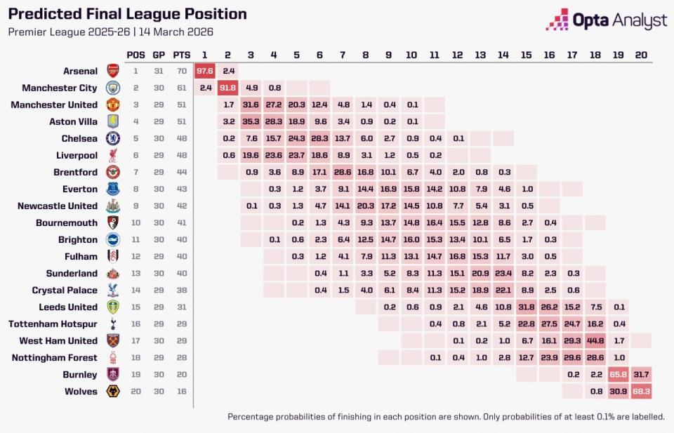 据OPTA利用超级计算机进行的10000次模拟,阿森纳夺得英超冠军的概率为97.6%,曼城夺冠概率为2.4%。至于其他英超18队,夺冠概率均为0%。