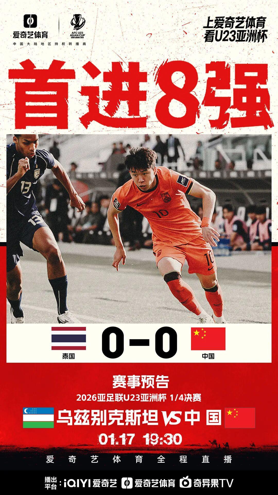 接下来U23国足将在1/4决赛中对阵乌兹别克斯坦。届时,爱奇艺体育将全程直播。
